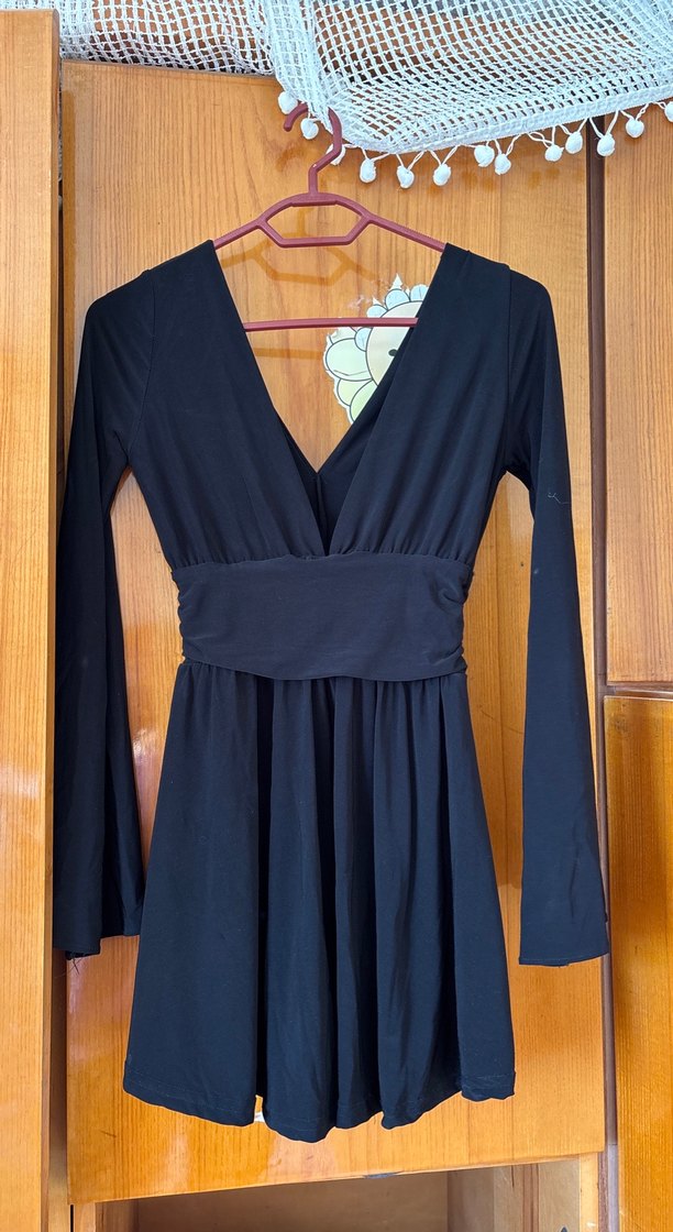 Bu uzun kollu siyah elbise, V yaka ve drapeli detaylara sahip, gotik tarzda romantik akşamlar için uygun.