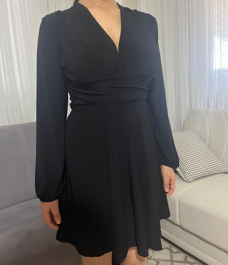 Uzun kollu, V yakalı ve drapeli detaylı siyah gotik tarzda, ofise uygun, vücuda oturan midi elbise. Hiç giyilmedi/ Trendyol kol 59 cm elbise boy 86 iki ol arası 40 cm bol 35