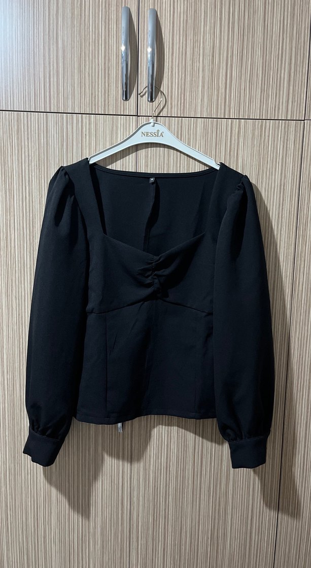 Siyah renkli, V yaka ve uzun kollu, drapeli detaylı kadın bluz. Normal kesim ve midi boyda, ofis ve gündelik şıklık için uygundur. Bir kez giydim sonrasında hiç kullanmadım. Trendyolmilla ürünüdür. Hatasızdır.