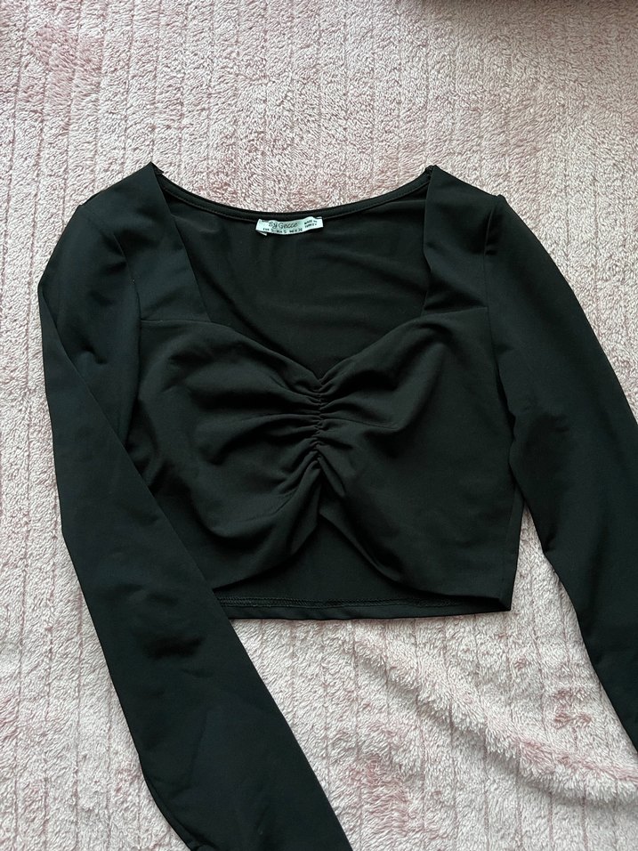Uzun kollu, V yakalı, önünde pile detaylı, siyah ve sade tasarımlı kadın bluz. Yumuşak sentetik kumaştan, midi boyda ve günlük kullanıma uygun.