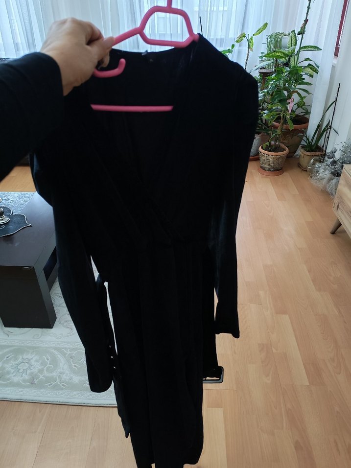 Uzun kollu, V yakalı, drapeli siyah midi kadıfe ön kapama detaylıelbise, gothic tarzda ve günlük kullanım için uygundur.