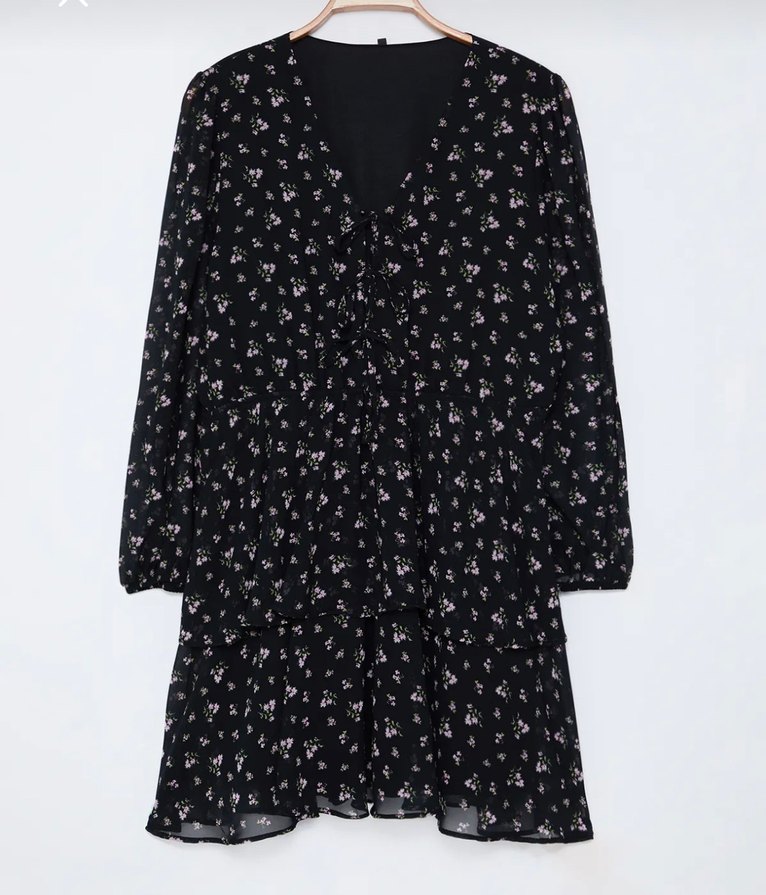 Uzun kollu, V yakalı ve bol kesim siyah midi elbise, fırfır detayları ve hafif çiçekli desen ile gündelik şıklık sunar.