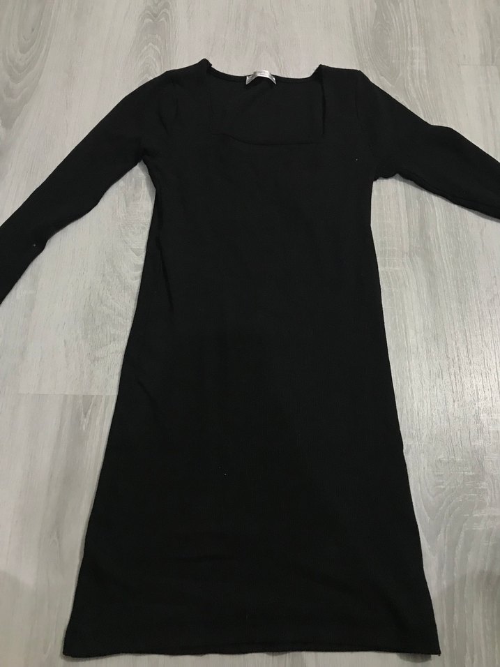 Bu siyah triko elbise, uzun kollu ve V yaka detaylarına sahip, düz ve sade tasarımlıdır. İnce yapılı, sentetik kumaştan, günlük kullanıma uygundur.