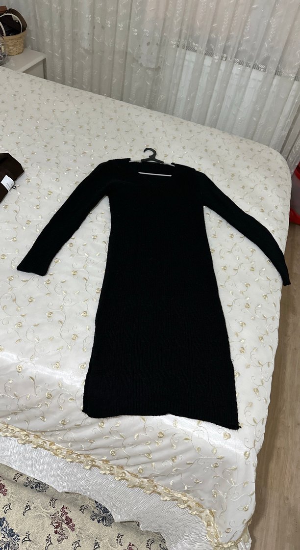 Uzun kollu ve V yakalı, siyah triko elbise.Boy 107 cm göğüs arası 40 cm triko olduğu için açılma yapar.akrilikdir sıcacık tutar.standart beden.tesettürde tunik olarakda kullanılabilir.bir iki kez giyildi yeniden farksızdır.