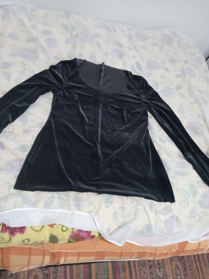 Bu siyah, v yakalı ve uzun kollu bluz, esnek kadife kumaş dikis kurşunları kızımız yakasını yapmadan bırakmış yakasına dantel veya bant takilabilir