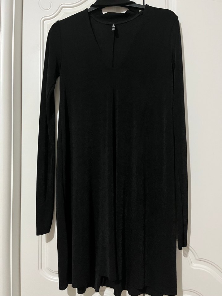 Uzun kollu, V yakalı, pilili detaylara sahip siyah elbise Midi boyu ve sentetik kumaşı ile ofis kullanımı için uygundur.