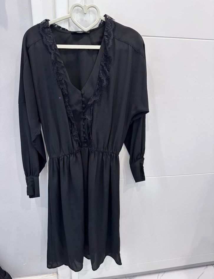 Uzun kollu, V yakalı siyah elbise, robalı ve işlemeli detaylara sahiptir. Gevşek kesimiyle gotik Paris tarzını yansıtır, ofis için uygundur.
