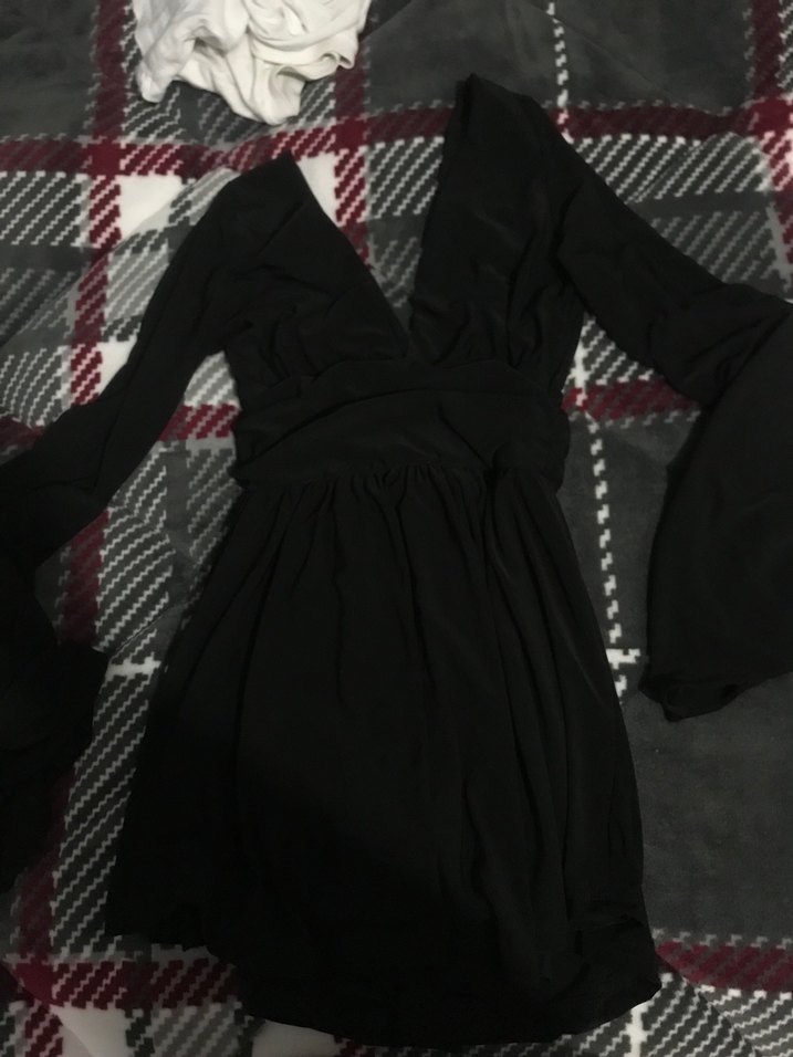 Bu siyah, uzun kollu, V yakalı ve drapeli elbise gotik tarzı ve parti için uygundur.