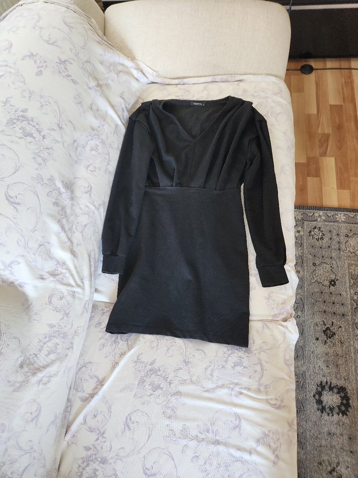 Uzun kollu, V yakalı siyah triko elbise, drapeli detaylarla trend bir görünüm sunar. Mini boyda, yumuşak sentetik kumaştan üretilmiştir.