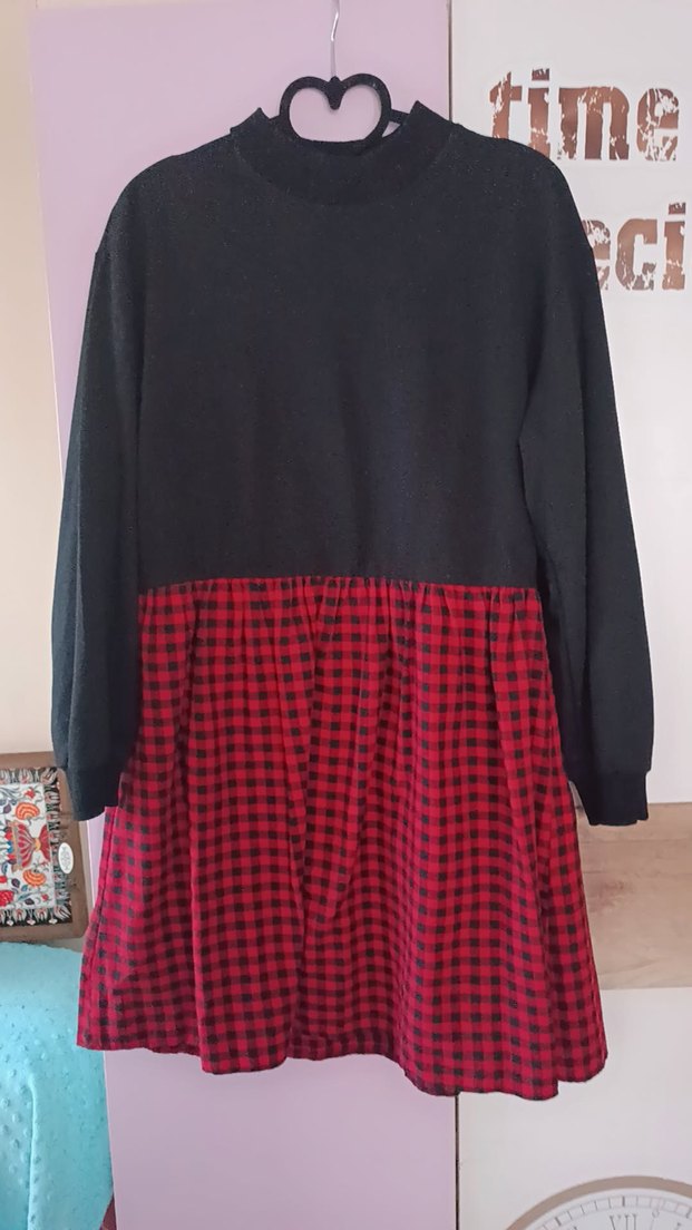 Bu elbise bol kesim, uzun kollu ve yuvarlak yaka özelliklerine sahiptir. Üst kısmı siyah ve yumuşak dokuludur, pileli etek kısmı koyu kırmızı kareli desendedir. 40 beden