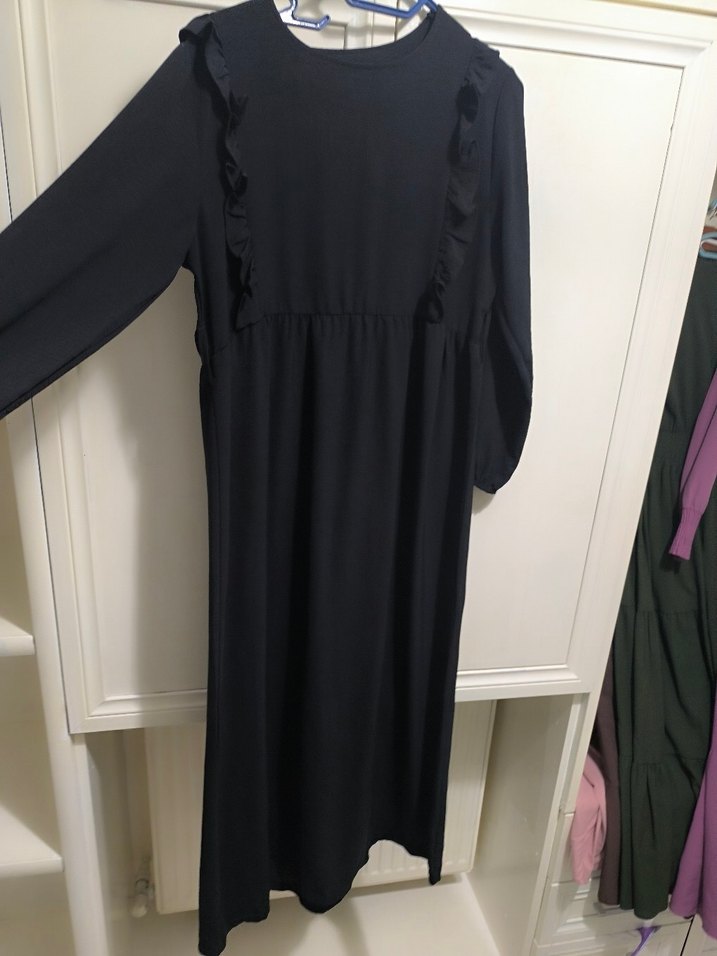 Uzun kollu, bisiklet yaka ve ön kısmında volan detayları bulunan siyah uzun elbise. Rahat kesimli ve pürüzsüz ayrobin kumaştan yapılmıştır. l xl XXL ye olur ayrobin kumaş kuşağı kayıptır