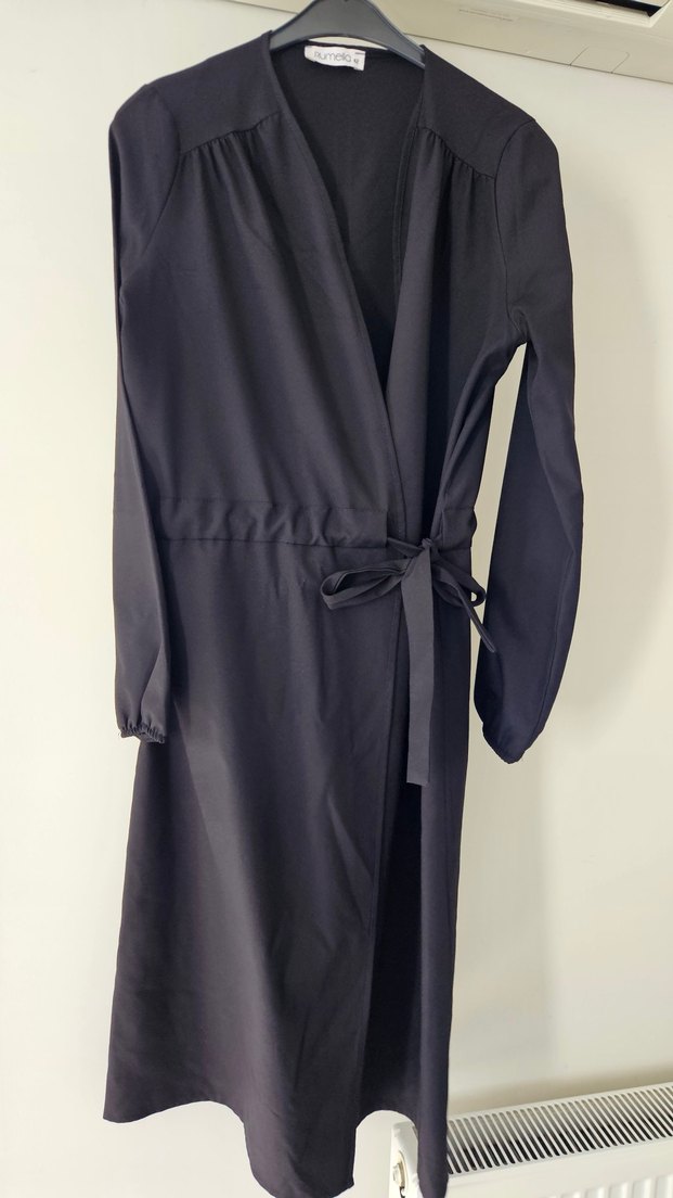 Uzun boy, siyah renkte, yakası kesik ve uzun kollu . yan Belden bağlama detayı ile rahat kullanım sağlar.