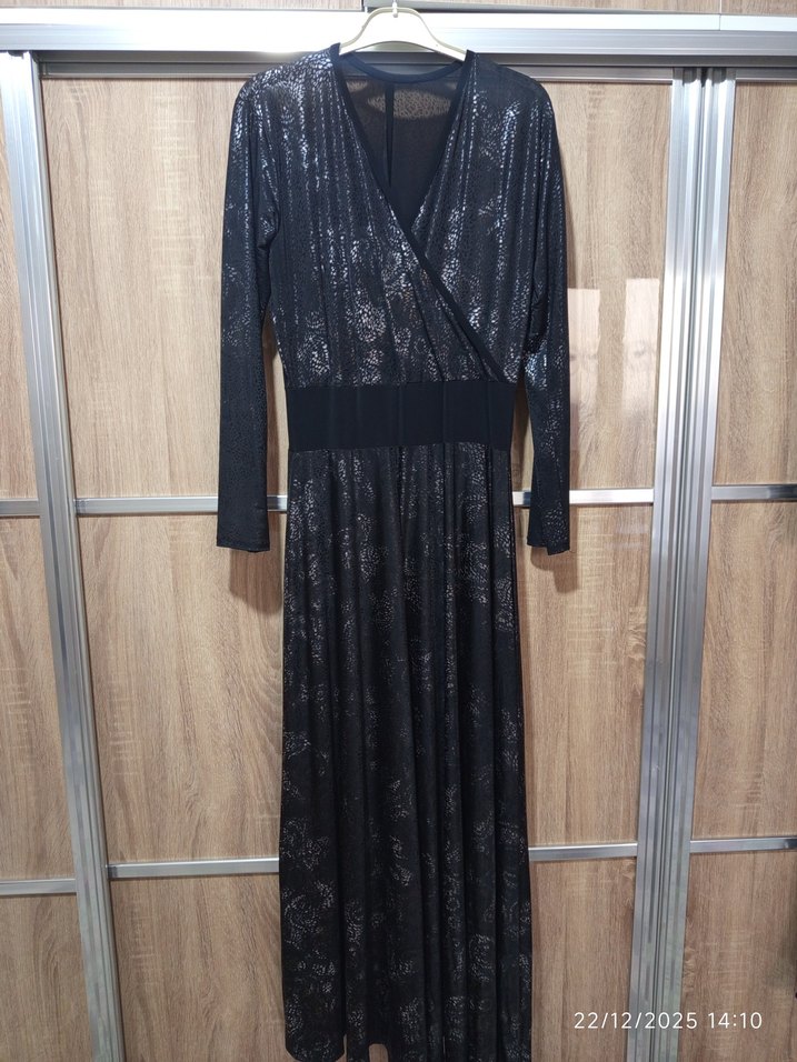 Yılan desenli, pileli uzun siyah elbise, V yakalı ve uzun kolludur. Salaş kesimiyle gotik tarzda ve ofis kullanımı için uygundur.