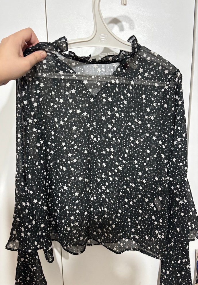 Rahat kesim, uzun kollu, yüksek yakalı ve fırfırlı detaylara sahip siyah yıldız desenli bluz. Sentetik kumaştan, günlük kullanıma uygun. ⭐36-38 beden