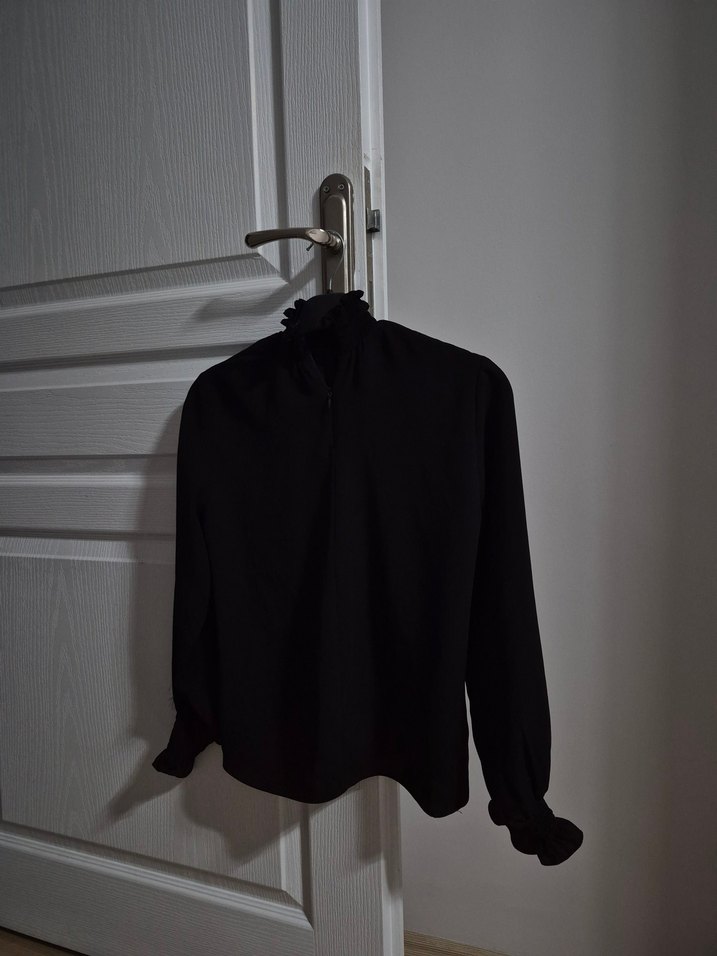 Siyah, uzun kollu ve düğmeli yüksek yakalı, ipeksi dokulu hafif bol kesim gotik tarzda gömlek. Ofis için uygun, avant-garde bir görünüm sunar.