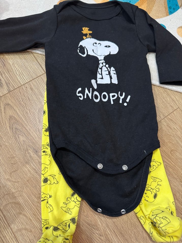 Yumuşak ve sıcak kumaştan, Snoopy baskılı uzun kollu bebek body. Kolay giydirme için çıtçıtlı detay içerir. Hediye geldi hiç kullanılmadı.