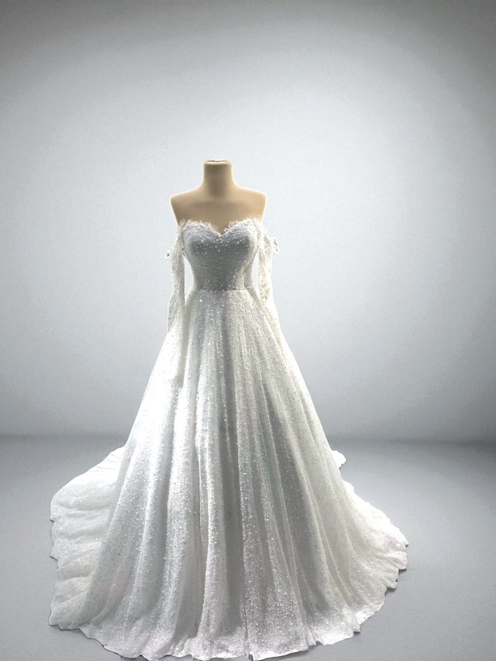 Bu beyaz A kesim gelinlik, straplez yaka ve uzun kollu olup, modern klasik tarzda göz alıcı bir şıklık sunar. Uzun boyuyla zamansız bir görünüm sağlar.