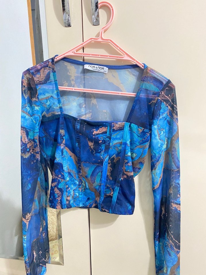 Dar kesim, straplez yaka ve uzun kollu kadın bluz. Koyu mavi bağlama desenli, dökümlü ve sokak modası tarzında, sentetik kumaştan, açık hava kullanımı için uygun.