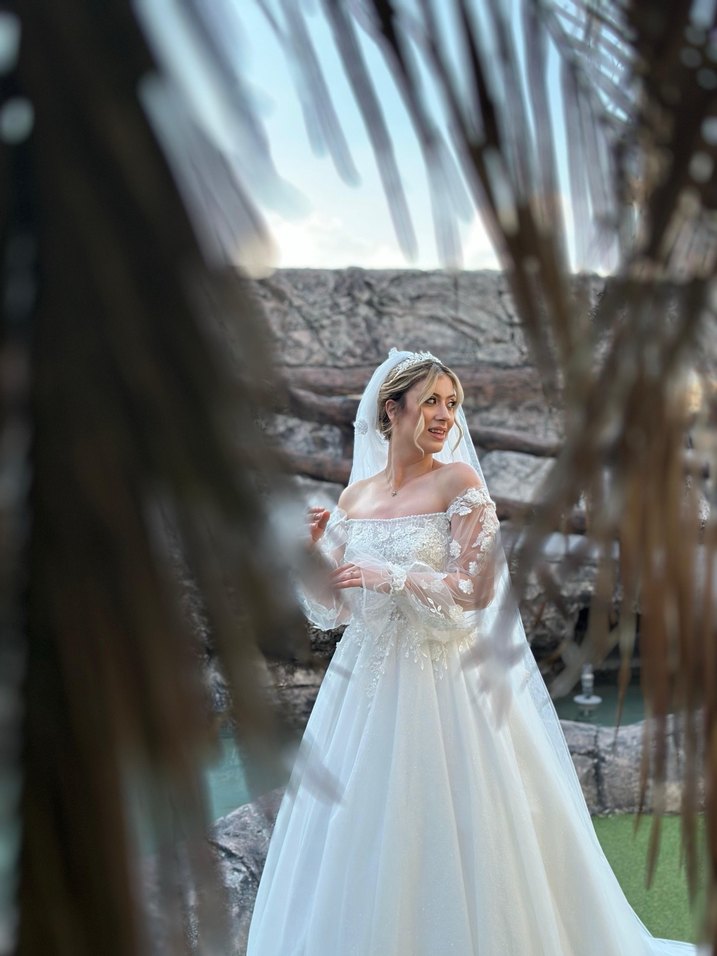 Bu bol kesim beyaz gelinlik, straplez yakalı ve uzun, ince çiçek detaylı şeffaf kollara sahiptir. Klasik A kesim ve uzun boyda olup geleneksel şıklığı hafif gotik dokunuşla buluşturur. Özel dikimdir.