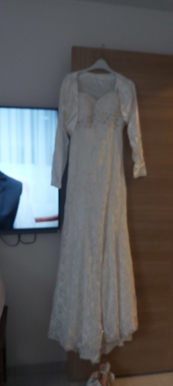Uzun kollu, straplez yakalı ve vücuda oturan A-line kesim beyaz gelinlik, klasik ve vintage tarzı bir araya getirir.