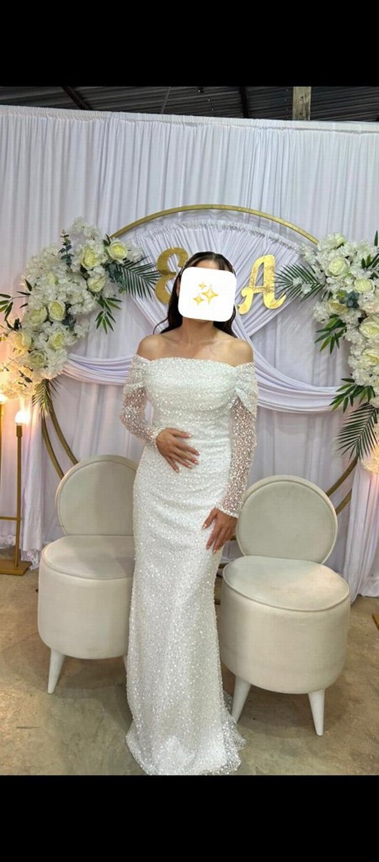Uzun kollu, straplez beyaz abiye, şeffaf kolları ve drapeli tasarımıyla modern klasik zarafeti yansıtıyor. ✨