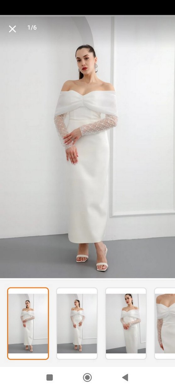 Uzun kollu, straplez yakalı beyaz düz gelinlik, modern klasik ve minimalist şıklığı bir araya getirir. İnce işleme detaylı şeffaf kollara sahiptir. 38 beden olmama rağmen abiye de her zaman büyük beden almak lazım o yüzden 42 beden aldım üst kısmı yine çok az dar oldu. ama 44 beden de çok büyük olurdu. hiç giymedim boydan çok az kestirildi