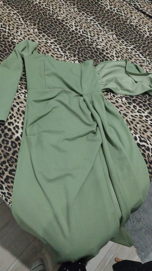 Khaki renkte uzun kollu, straplez yakalı, drapeli ve vücuda oturan minimalist tarzda kadın elbisesi.