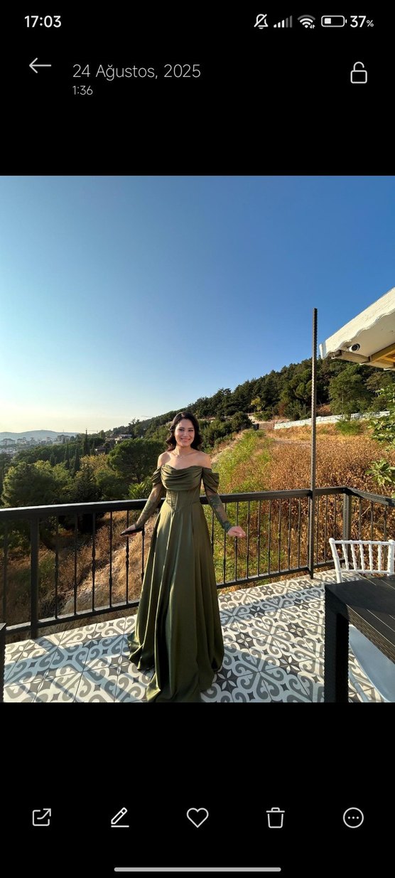 Koyu haki renkli, ince ve parlak kumaştan, uzun kollu, straplez, drapeli detaylı, bol kesim uzun elbise. Gotik ve bohem tarzıyla klasik şıklık sunar.