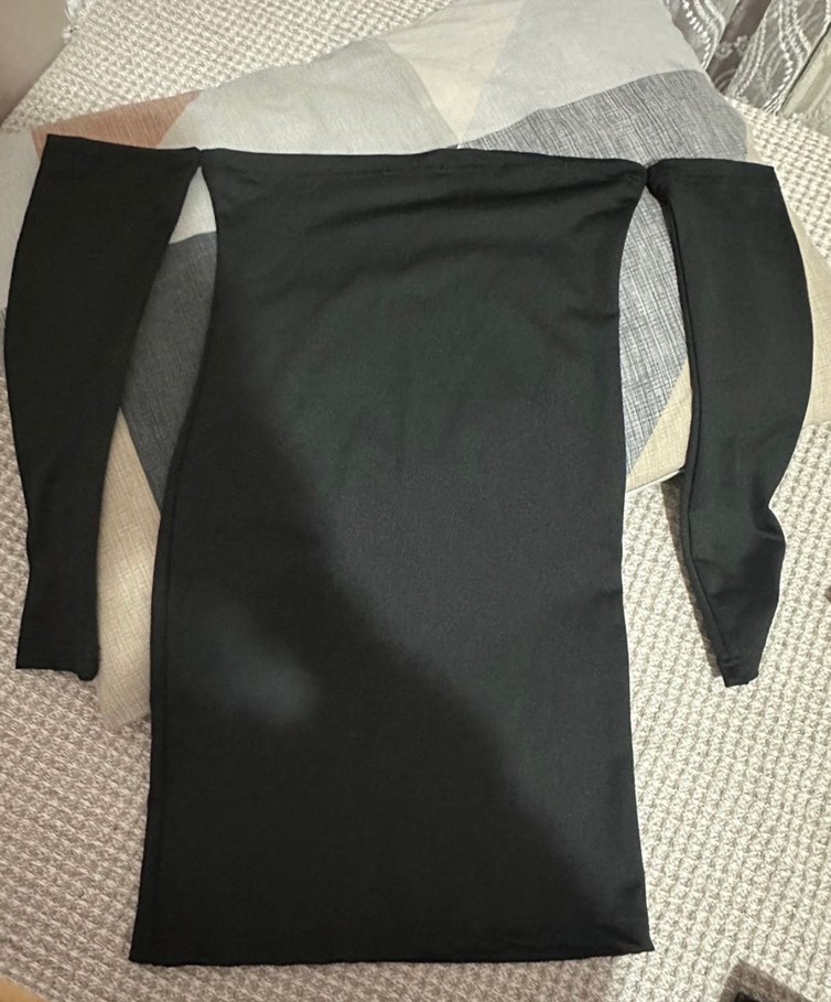 Siyah renkte, straplez yaka ve uzun kollu, drapeli detaylı midi kalem elbise. Vücuda oturan kesimi ve minimal tarzıyla günlük kullanıma uygundur.