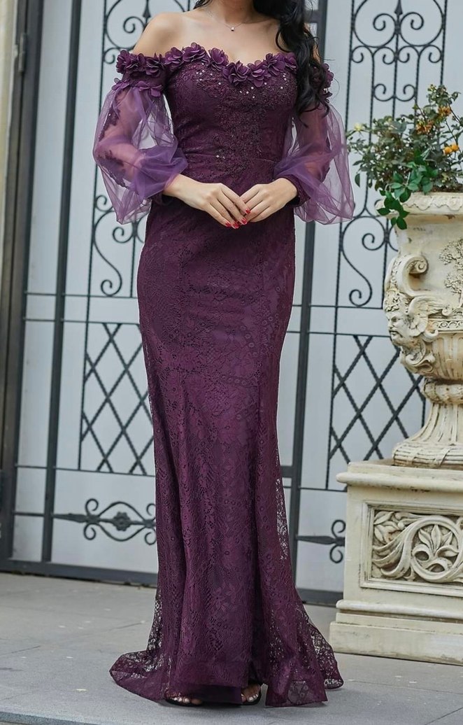 Koyu mor, uzun kollu, straplez ve drapeli çiçek detaylı, işlemeli, klasik şıklıkta fitted abiye elbise. Düğünler için goth tarzda uzun elbise.