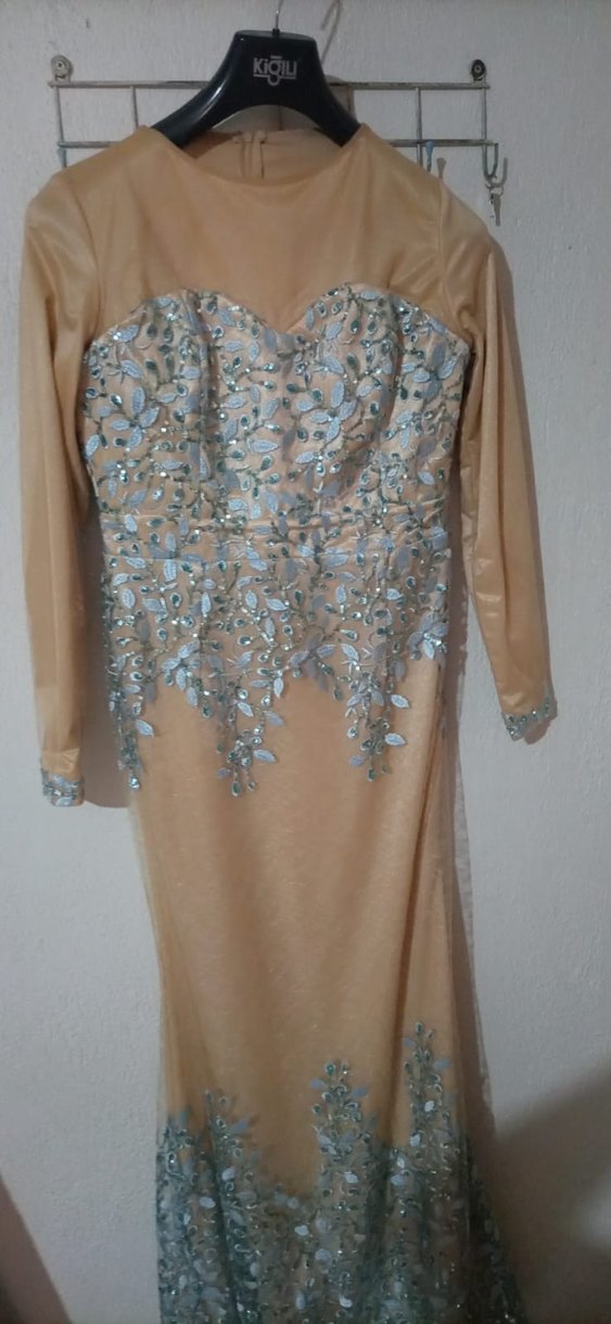 Uzun kollu, straplez yakalı ve nakış işlemeli bej abiye elbise. Dökümlü ve klasik kesime sahip, düğünler için uygun.