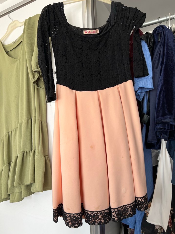 Uzun kollu, straplez yakalı, pilili pembe etek ve siyah dantel üst kısmı olan, günlük kullanıma uygun, bol kesim gotik tarzda kadın elbisesi. Kullanmadığım için hafif lekeleri var ama yıkamada geçer
