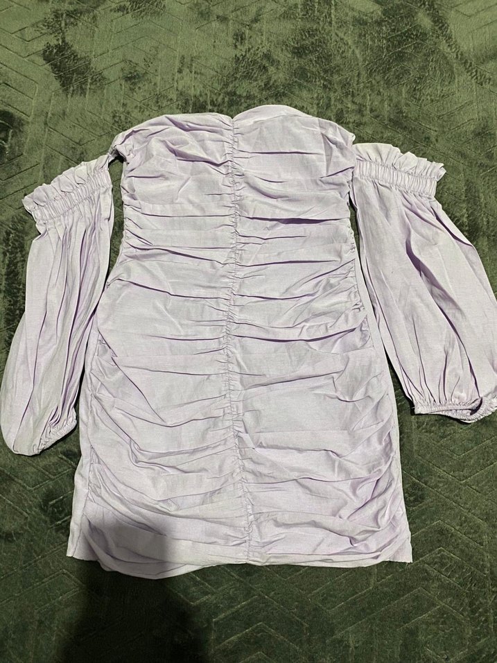 Linen kumaştan, pilili ve vücudu saran mor mini elbise. Uzun kollu ve straplez kesime sahip, parti için uygun.