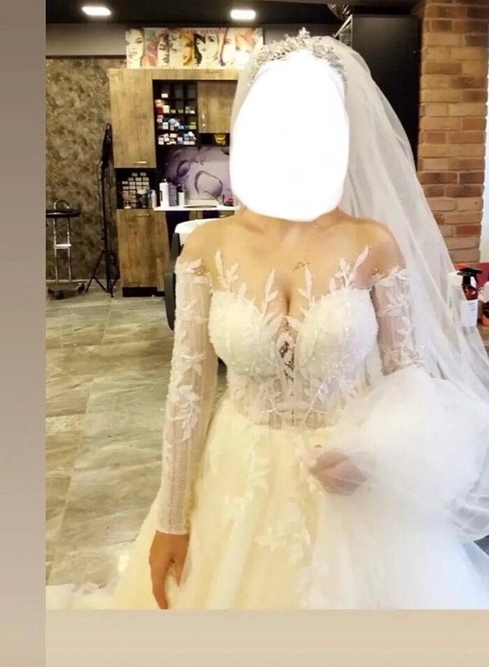 Krem prenses gelinlik, straplez yaka ve uzun transparan kollara sahip, klasik zarafet ile bohem tarzını birleştiriyor. Uzun boyda ve ince dantel detaylıdır. Krem rengi 38-40 beden uyumlu.kuru temizleme yapıldı.duvak dahildir.Sadece salonda giyildi