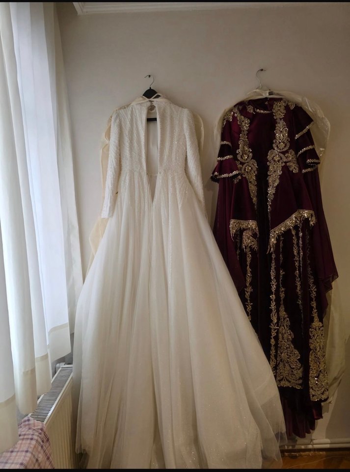 Bu uzun kollu, straplez prenses gelinlik vintage tarzda, koyu beyaz tonunda klasik ve zarif bir görünüm sunar. Fit kesimiyle şıklık sağlar. bir kez giyilmiştir tertemizdir alana şimdiden hayırlı olsun