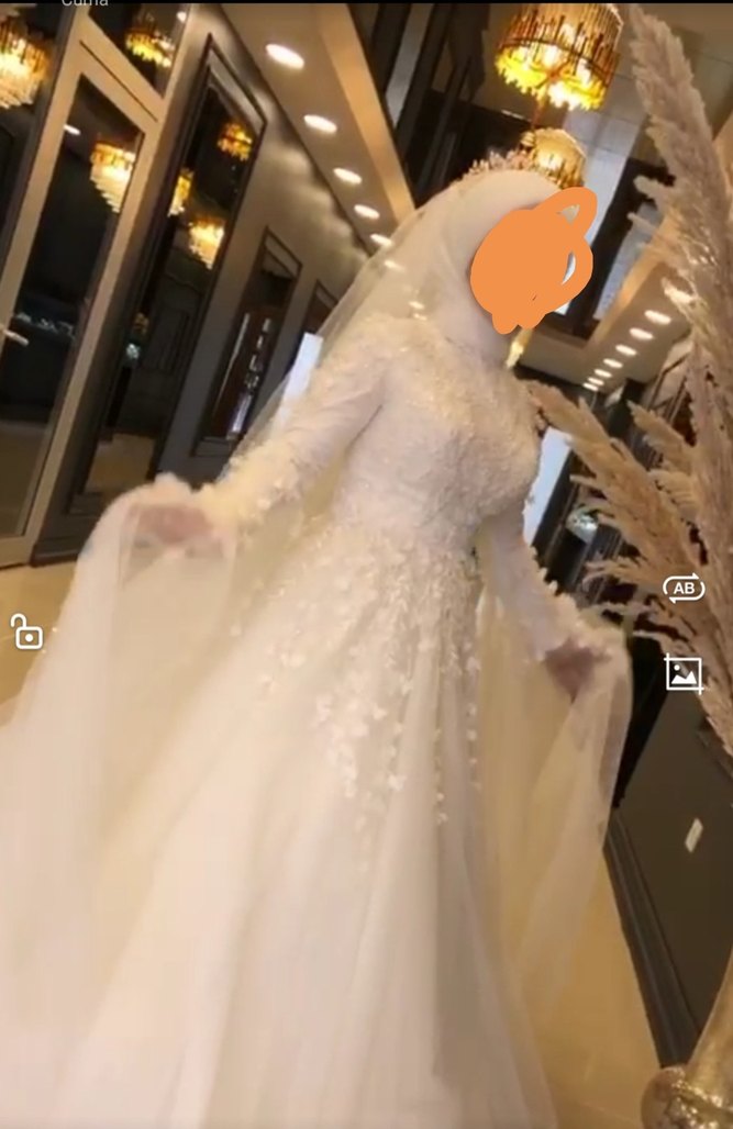 Bu dar kesim prenses gelinlik, uzun kollu ve straplez yakaya sahip, hafif beyaz kumaştan zarif detaylarla tasarlanmıştır. Parlak bir düğün görünümü için idealdir. Bir kere giyildi.