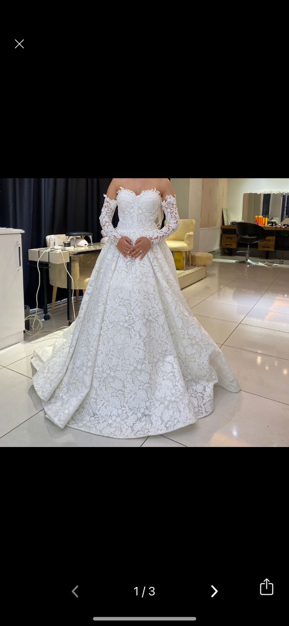 Uzun kollu ve straplez kesime sahip, dantel detaylı, klasik modern görünümlü prenses kesim gelinlik. Hafif beyaz rengiyle zarif bir şıklık sunar. 36-38 beden için uygundur