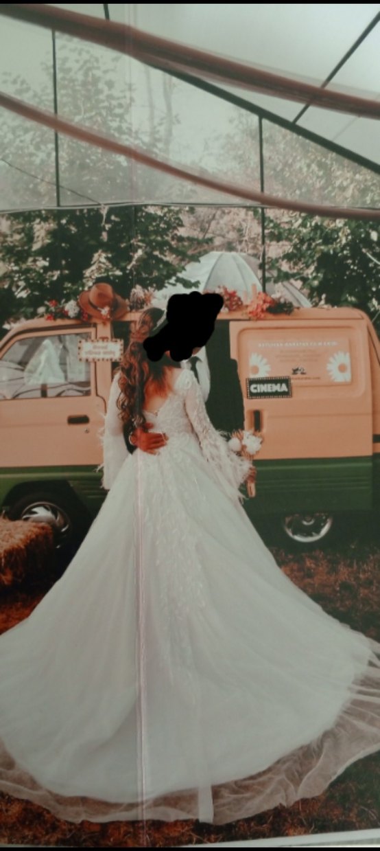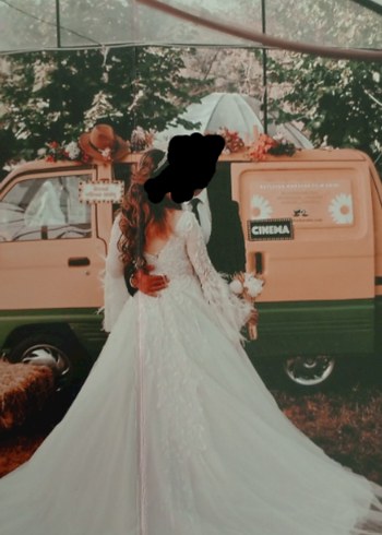 Uzun kollu, straplez yakalı ve fit kesim prenses gelinlik. Hafif beyaz rengiyle klasik, bohem ve gotik tarzları bir araya getirir. yıkatılması gerekiyor