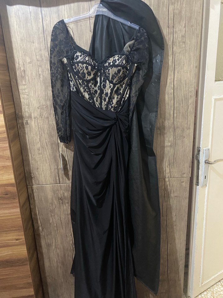 Bu dar kesim siyah abiye elbise, straplez desenli gövde, uzun dantel kollar ve drapeli uzun etek ile gotik düğünler için uygundur.
