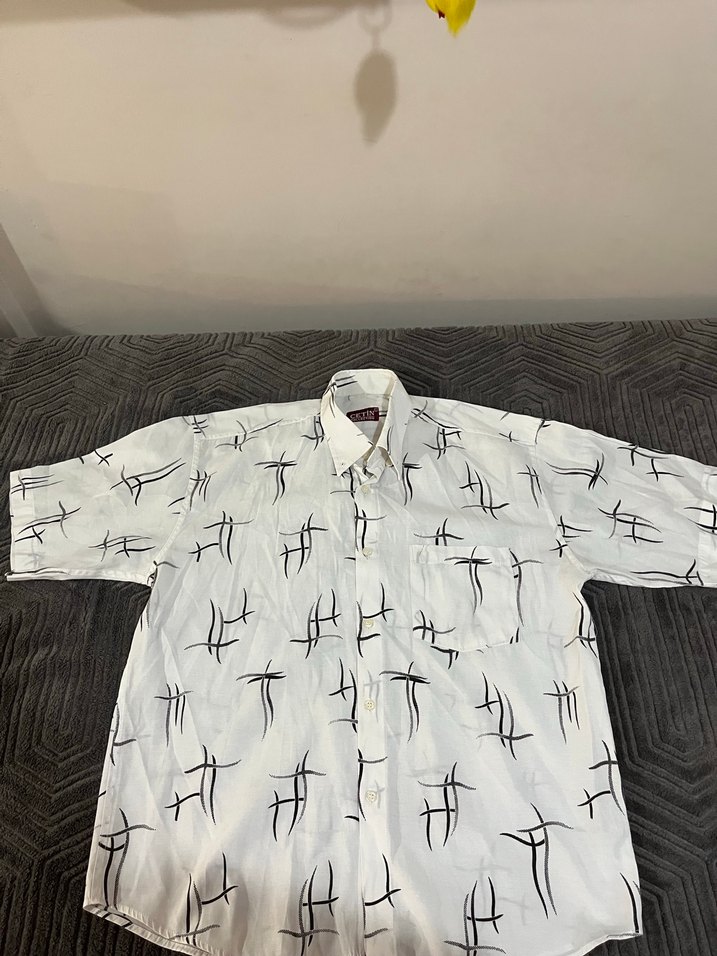 Uzun kollu, tekne yaka ve bol kesim erkek gömleği. Keten kumaştan, beyaz ve gri batik desenli, düğmeli, günlük kullanım için uygundur.