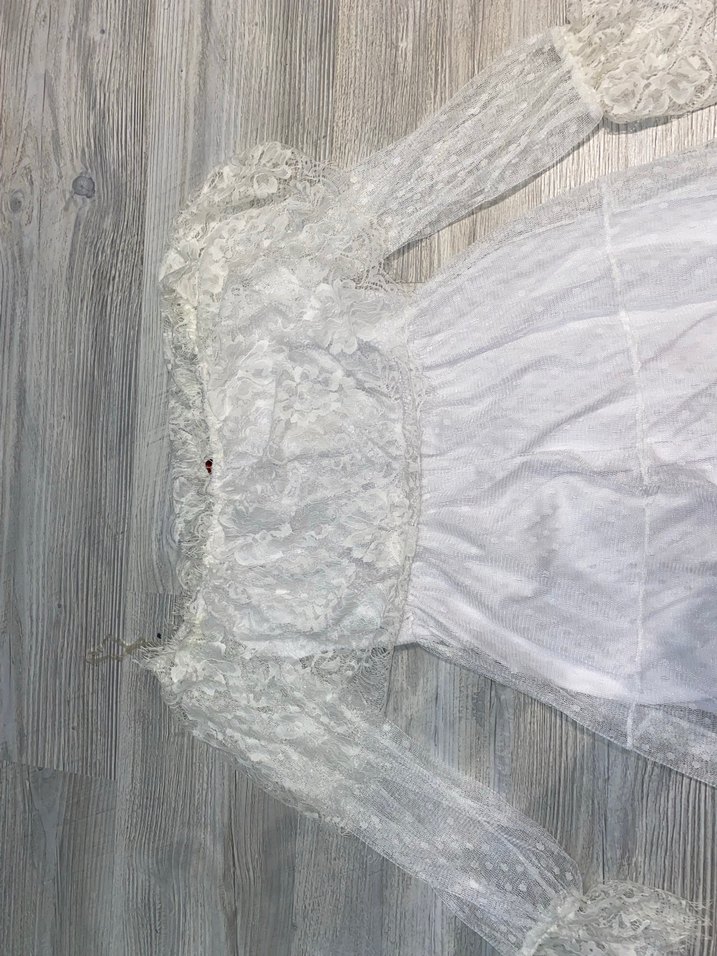 Uzun kollu ve tekneden yaka olan bu beyaz gelinlik, bohem tarzda ve dantel detaylıdır. Retro ve hippie etkileriyle şık bir görünüm sunar. Esnek olduğu için 38 bedene kadar uyumludur
