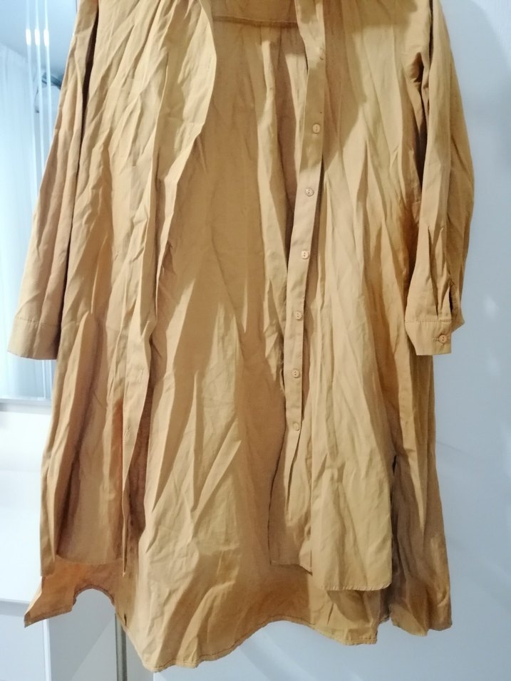 Hardal sarısı uzun tesettüre uygun gömlek. Ön kısmı arka kısmına göre daha kısa arkası ni tık daha uzun modelli yani. Ütüsüz olduğu için böyle duruyor 2 3 kez giyildi yeni sayılır bir defosu yoktur. İster kapalı istee içine tişörtle giyilebilir.