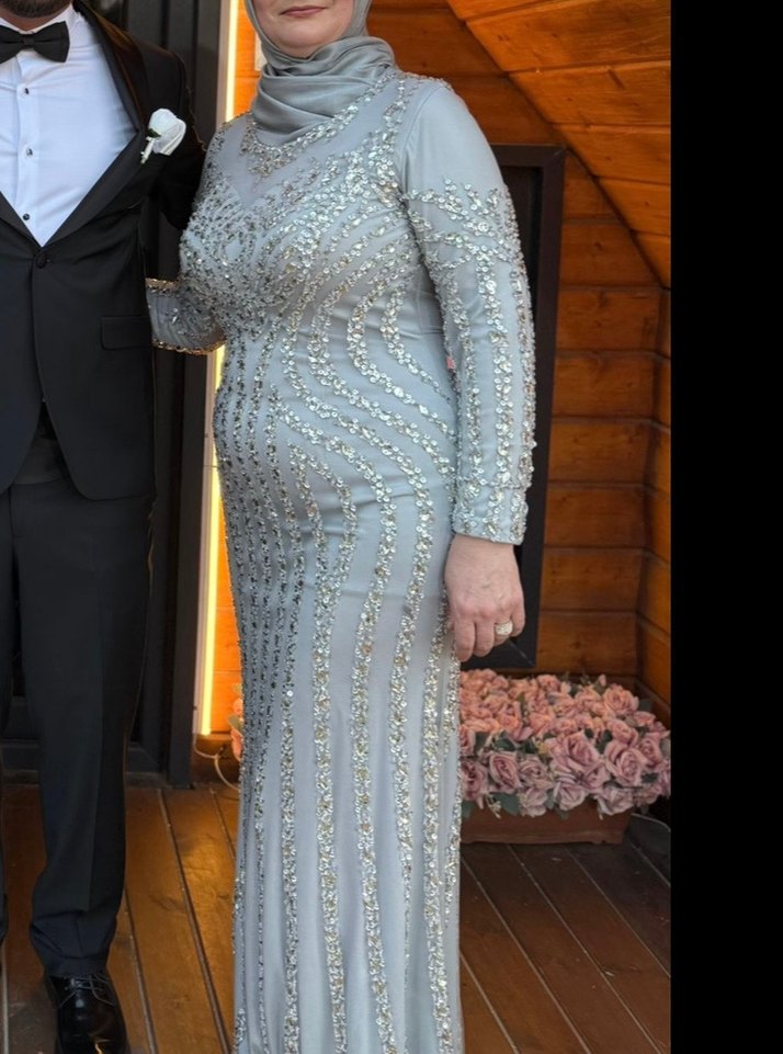 yaka ve uzun kollu, gri renkli özel ital taş işlemeli, klasik şıklıkta uzun abiye elbise. Düğün ve özel anlar için uygundur. ✨