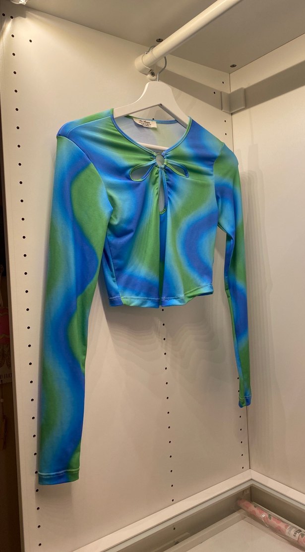 Bu kadın bluzu, uzun kollu ve yuvarlak yakalıdır. Önünde düğme detayı vardır. Pastel mavi ve yeşil tonlarındaki tie-dye deseni bohem ve retro bir görünüm sağlar. Sentetik kumaştan yapılmış, kısa kesim ve çağdaş stilde. Hiç giyilmedi sıfır yeni temiz xs s bedene uygun