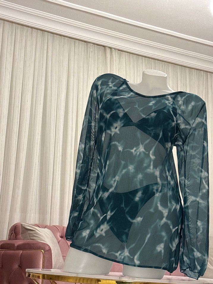 Uzun kollu, bisiklet yaka ve bol kesim kadın plaj üstü, şeffaf sentetik kumaş ve mavi-gri batik deseniyle modern, avangart bir tarza sahiptir. Bikini takımı 3’lü Marka temsilidir
