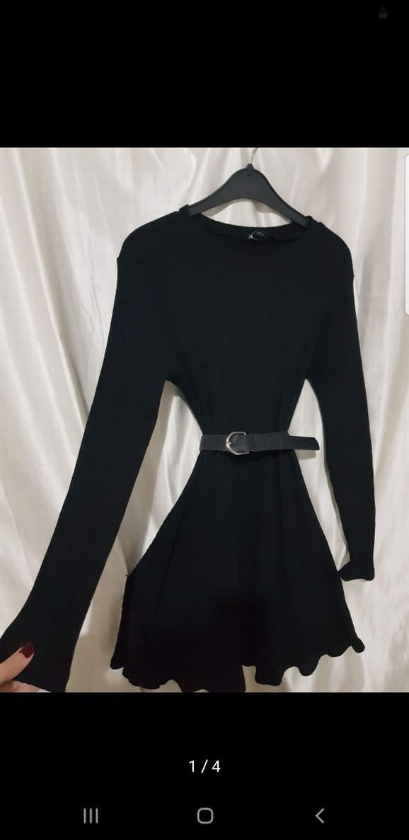 Bu siyah kemerli triko elbise, uzun kollu ve yuvarlak yakalıdır. Minimalist gotik tarzıyla midi boyda ve yumuşak sentetik kumaştan üretilmiştir.
