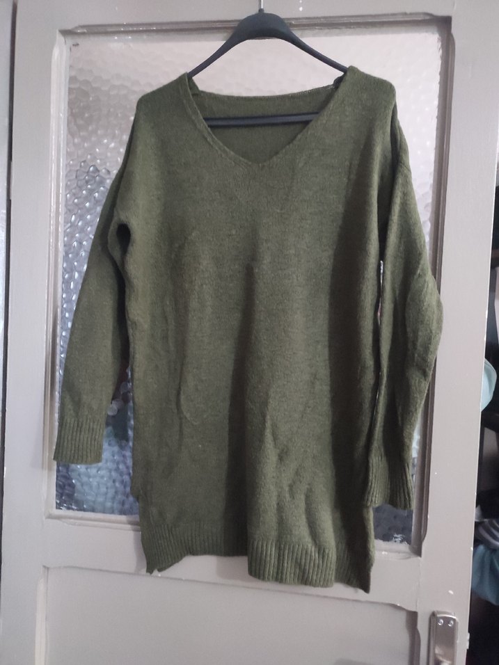 haki renkte, V yakalı, uzun kollu, bol kesim triko kadın kazak, günlük rahat kullanım için uygundur.