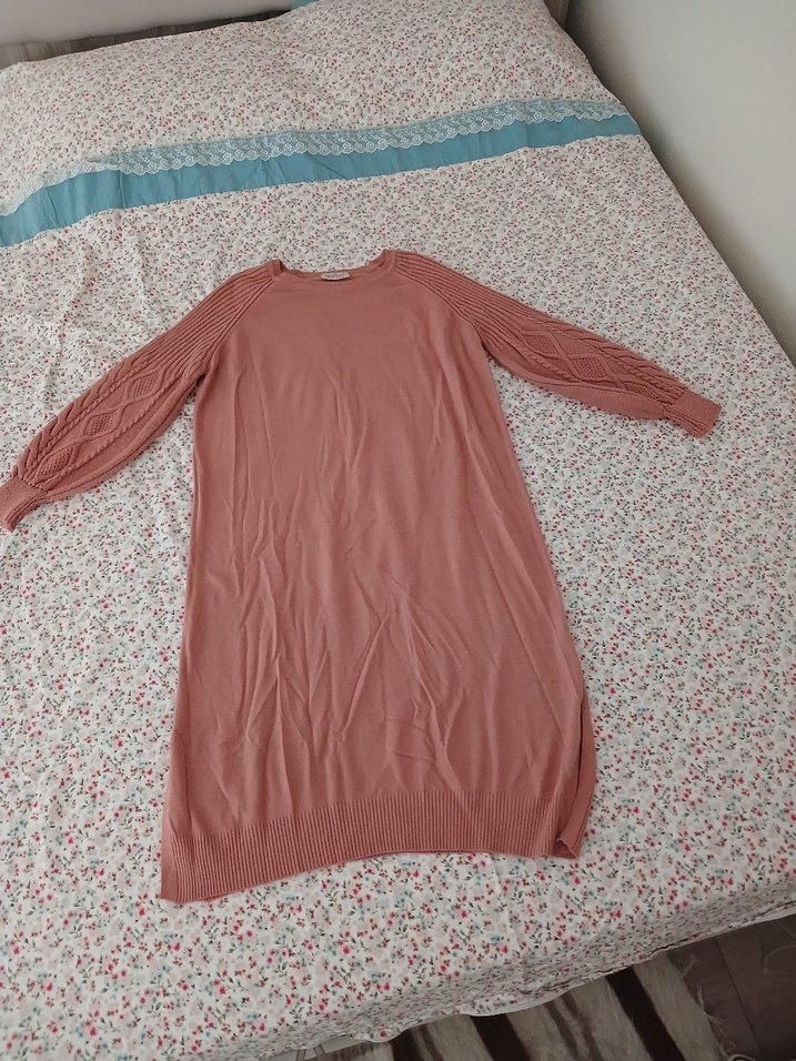 Pembe tonlarda, uzun kollu ve bol kesim triko elbise. Örgü detayları rahat bir kullanım sunar.