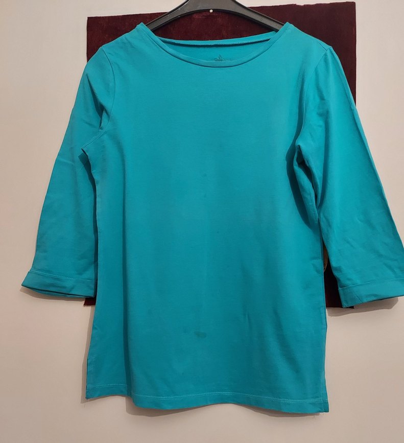 Bu turkuaz bayan tişörtü yuvarlak yaka ve uzun kolludur. Yumuşak pamuktan üretilmiş, bol kesim ve normal uzunluktadır, günlük kullanıma uygundur. Düz, desensiz tasarımı minimalist stile uygundur.
