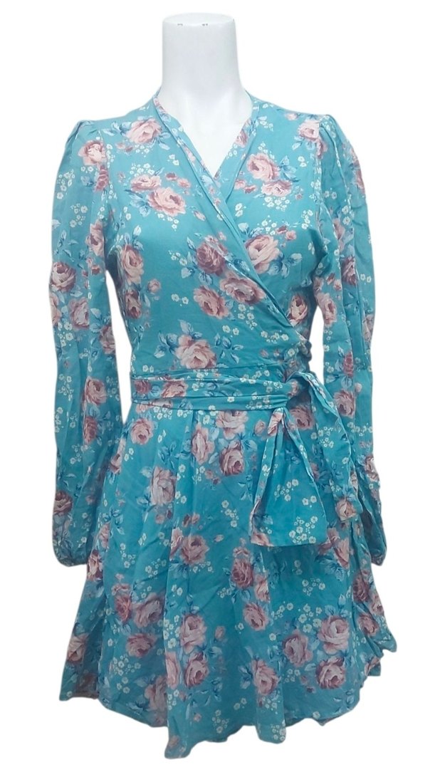 Uzun kollu, V yakalı, turkuaz çiçek desenli mini elbise. Bol kesim ve fırfır detaylarıyla bohem tarzını yansıtır.